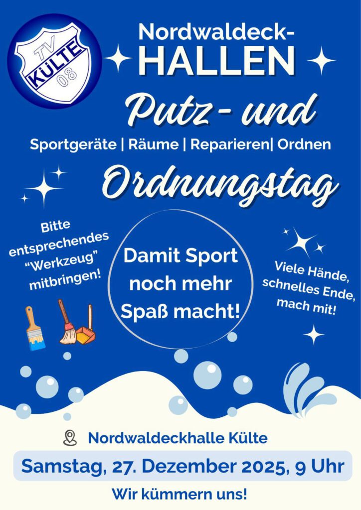 Am 27.12.2025 wurde vom TV 08 Külte ein Putz- und Ordnungstag in der Nordwaldeckhalle durchgeführt. Zahlreiche Teilnehmer haben gereinigt, repariert, renoviert und Ordnung geschaffen. Somit wurde ein wertvoller Beitrag zur Unterhaltung und Pflege der Külter Halle geleistet. Vorab wurden bereits Putz- und Malerleistungen erbracht. Der Vorstand bedankt sich bei allen Beteiligten für den außerordentlichen Einsatz.