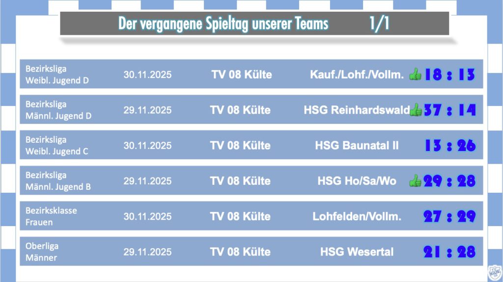 Ein durchwachsenes Wochenende für die Külter Teams, wenn man den reinen Ergebnisblock betrachtet. Die weibliche Jugend D gewann gegen die JSGwD aus Kaufungen/Lohfelden/Vollmarshausen mit 18:13. Die männliche Jugend D erspielte sich ein deutlicheren Sieg mit 37:14. Die weibliche Jugend C unterlag der zweiten Garnitur der HSG Baunatal mit 13:26. Einen umjubelten Heimsieg gegen die HSG Hoof/Sand/Wolfhagen schaffte die männliche Jugend B mit 29:28. Super, Jungs!
