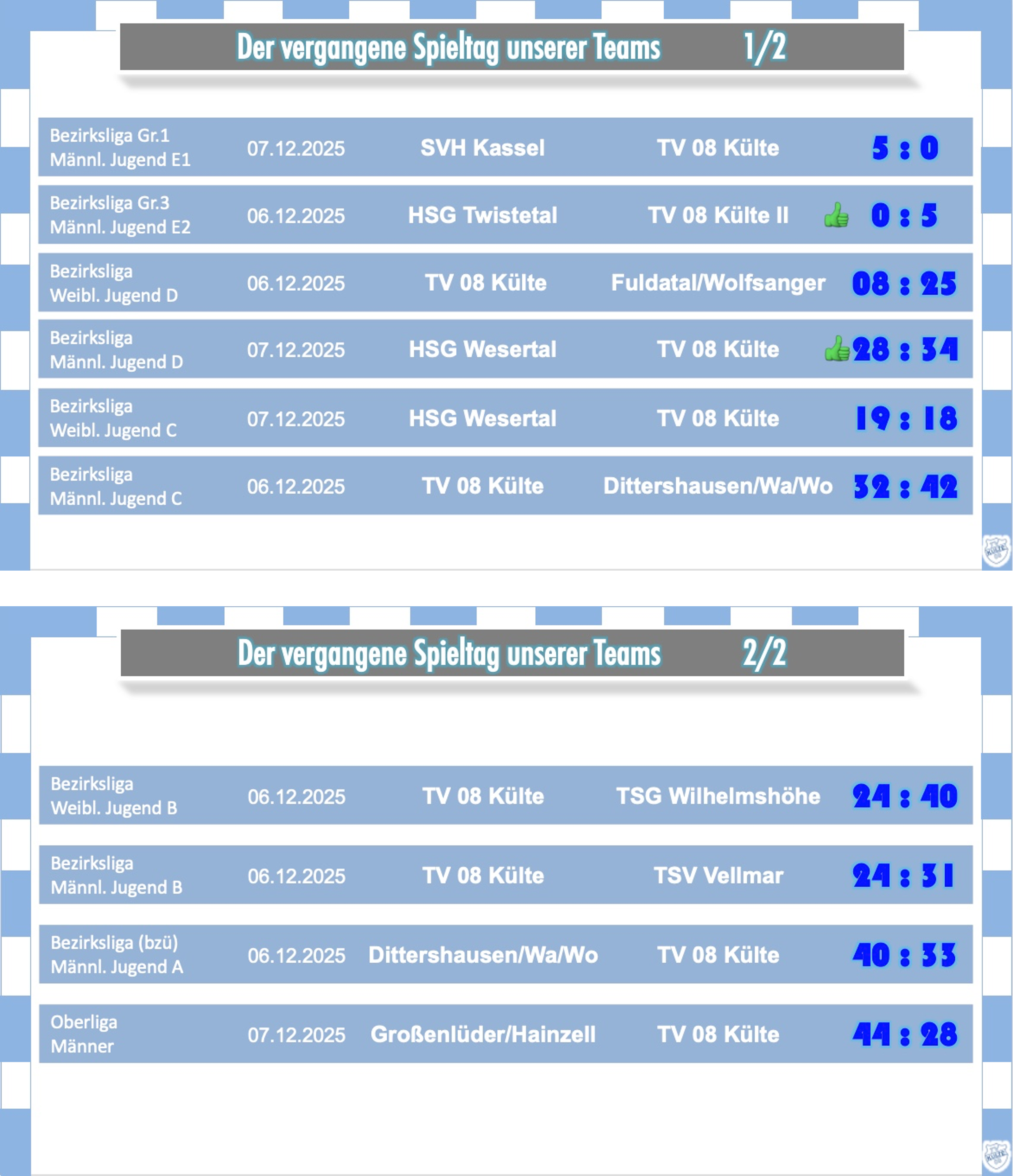 Eine deutliche Niederlage mit 44:28 mussten auch die Männer in Großenlüder bei der HSG Großenlüder/Hainzell im Oberligaspiel einstecken. Gegen einen der bisher stärksten Gegner in dieser Klasse hatte das Külter Team keine Mittel mitzuhalten. Aber sie ließen nicht die Köpfe hängen und gaben bis zum Schluß alles. Der wieder in sehr großer Anzahl mitgereiste Anhang feierte das Team dafür nach der Schlußsirene anerkennend. Positiv war auch, dass im letzten Spiel vor der Winterpause keine weiteren verletzten Spieler zum Lazarett dazugekommen sind. Jetzt heisst es neue Kräfte sammeln, um am 17.01.2026 im nächsten Spiel bei der ESG Gensungen/Felsberg II wieder voll dazu sein.