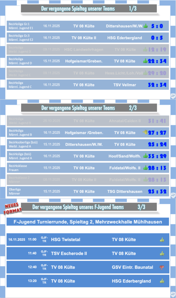 Die männliche Jugend E gewann gegen Dittershausen, während die E2 gegen die HSG Ederbergland verlor. Die männliche Jugend D überzeugte bei der HSG Hofgeismar/Grebenstein mit einem 22:34. Mit zwei Toren musste sich die männliche Jugend C gegen den TSV Vellmar geschlagen geben. Mit einem Unentschieden 27:27 musste sich die männliche Jugend B bei der HSG Hofgeismar/Grebenstein zufrieden geben. Der 33:29 Sieg der männlichen Jugend A gegen die HSG Hoof/Sand/Wolfhagen wurde überschattet von der schweren Verletzung von Carlo Goldfuss. Sein Bruder Mariano musste ebenfalls nach dem Spiel zum Röntgen ins Krankenhaus. Wir wünschen beiden Jungs an dieser Stelle eine gute Besserung.