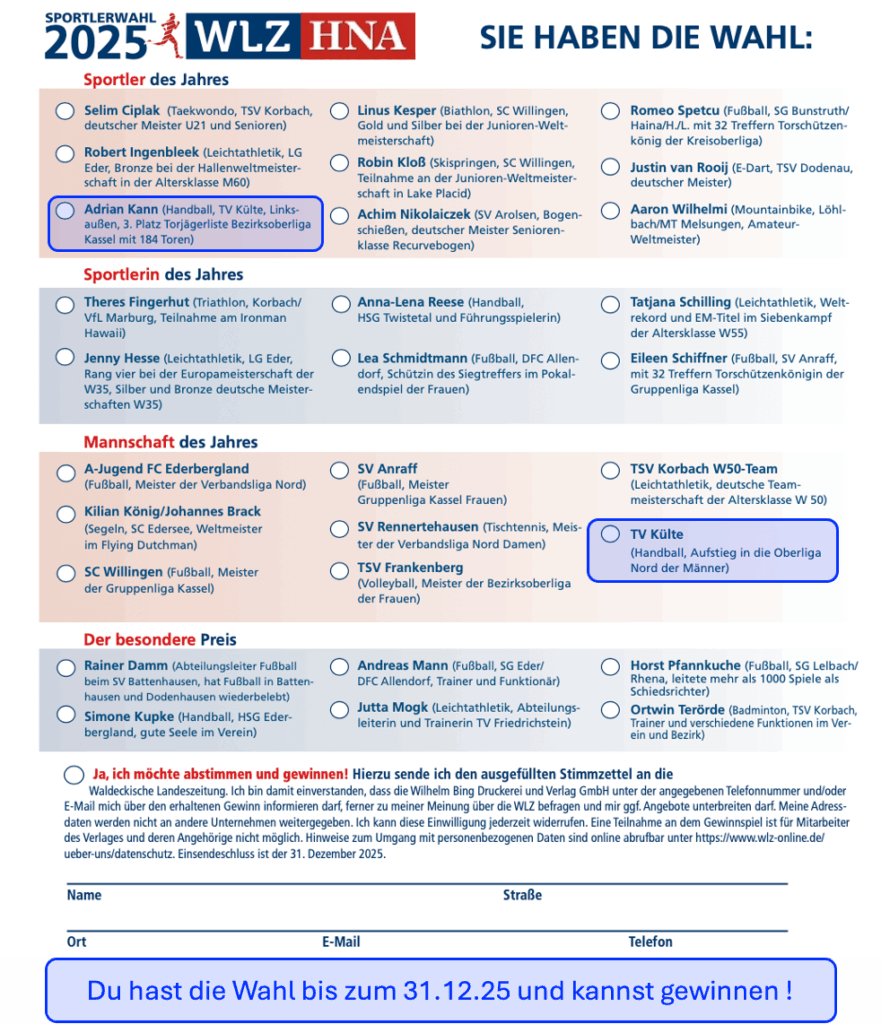 Nominierung bei der Wahl der Sportler des Jahres 2025 der WLZ. Tolle Anerkennung für den Külter Handball.