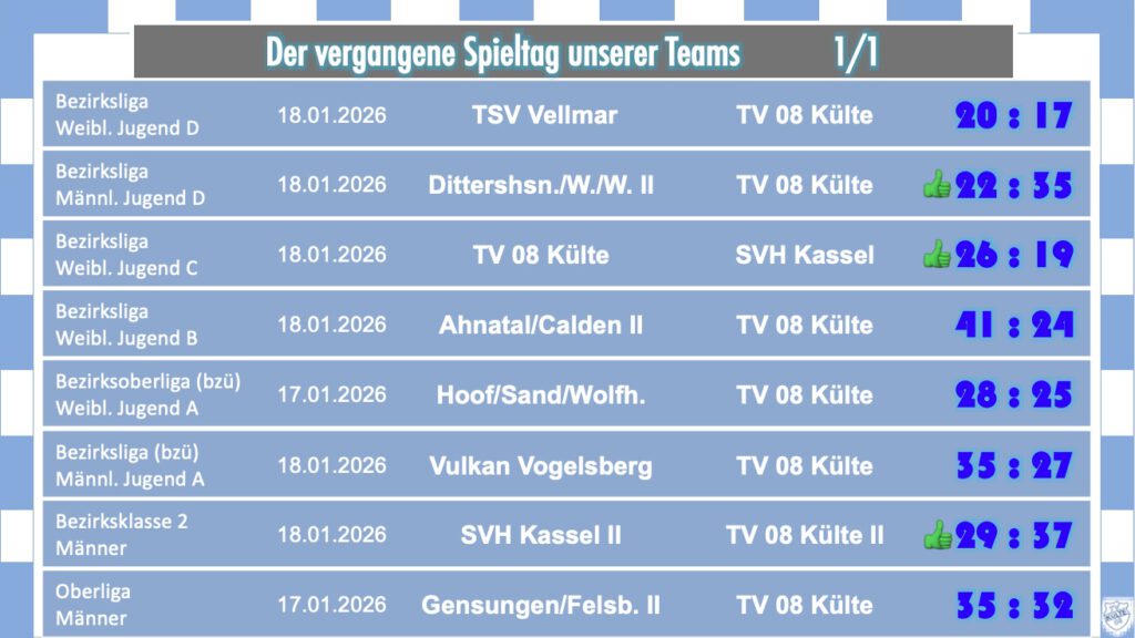 Die weibliche Jugend D verlor mit 20:17 in Vellmar. Besser machte es die männliche Jugend D mit einem deutlichen 22:35 Sieg bei der JSG Dittershausen/Waldau/Wollrode. Auch die weibliche Jugend C erzielte einen souveränen Heimsieg mit 26:19 gegen die SVH Kassel. Die weibliche Jugend B verlor mit einem deutlichen 41:24 bei der HSG Ahnathal/Calden II. In der bezirksübergreifenden Bezirksoberliga der weiblichen Jugend A verloren die Külter Mädels mit ordentlichem Spiel jedoch mit 28:25 bei der HSG Hoof/Sand/Wolfhagen. Die weite Reise nach Lauterbach zur HSG Vulkan Vogelsberg der männlichen Jugend A in der bezirksübergreifenden Bezirksliga wurde nicht mit Erfolg gekrönt. Man musste sich dem besseren Spiel der HSG Vogelsberg mit 35:27 beugen.