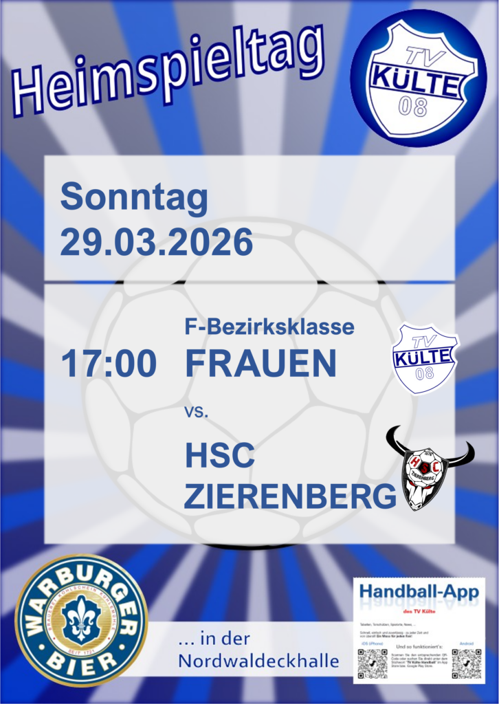 Am Sonntag, den 29.03.26 findet um 17.00 Uhr das Nachholspiel in der Bezirksklasse der Külterinnen gegen das Frauenteam des HSC Zierenberg in der Nordwaldeckhalle statt.